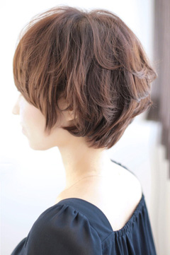 くせ毛風パーマの大人ボブ♪厚めバングの前下がりマッシュ■似合わせカットは大人かわいい斜めバングで小顔に^^耳かけスタイリングにもバッチリの伸ばしかけに最適なショートスタイル■パーマは無造作にルーズな動きが出るようにカールをつけます♪